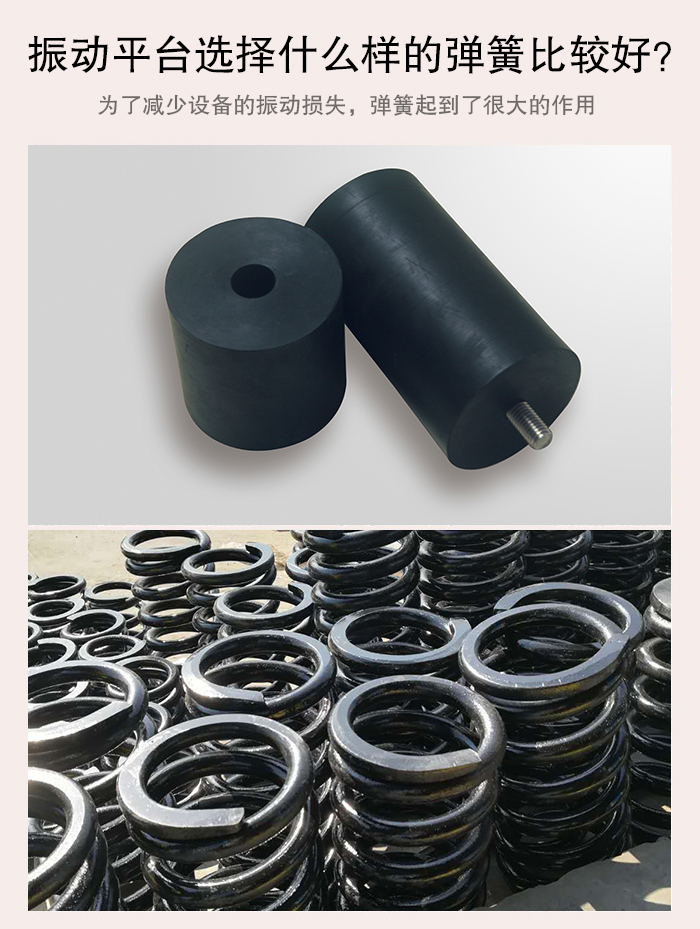 振动平台其主要的就是振动,而振动对于设备会有一定的影响,其为了减少设备的振动损失,其弹簧启到了很大的作用,所以在弹簧的选择上就要特别的注意那么振动平台选择什么样的弹簧比较好呢?小编推荐橡胶弹簧理由如下