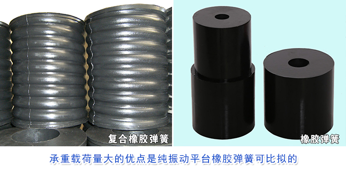 振动平台橡胶弹簧形状不受限制,有较大的弹性变形,容易实现非线性要求,减振隔音效果良好。复合振动平台橡胶弹簧相比较振动平台橡胶弹簧,前者形状受金属螺旋弹簧限制,线性要求高,重量重,但是其承重载荷量大的优点却不是纯振动平台橡胶弹簧可比拟的。