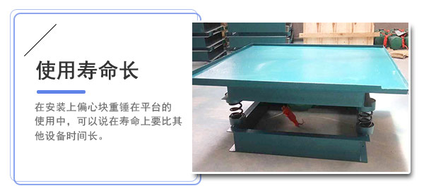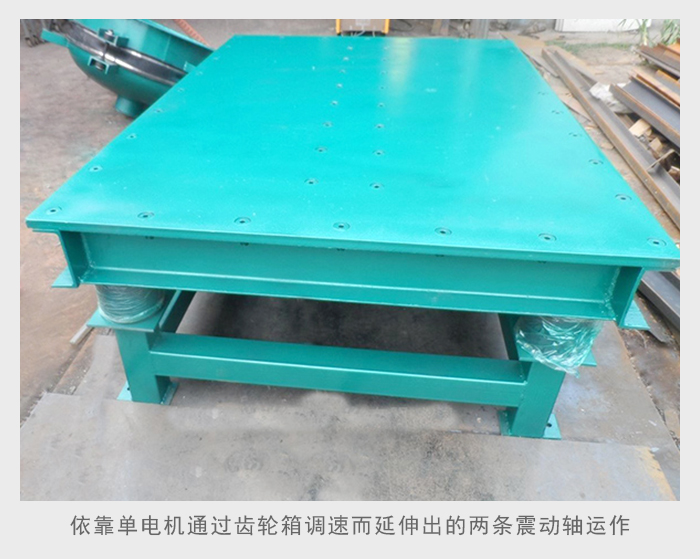 该产品主要靠单电机通过齿轮箱调速而延伸出的两条震动轴,在安装上偏心块重锤在平台的使用中,可以说在寿命时限中要的多,首先电机本身不产生振动性损坏,对电机寿命起到了很好的保护作用,但其缺点就是四周受力不均匀,平台的四周震动幅度有很大的变化。