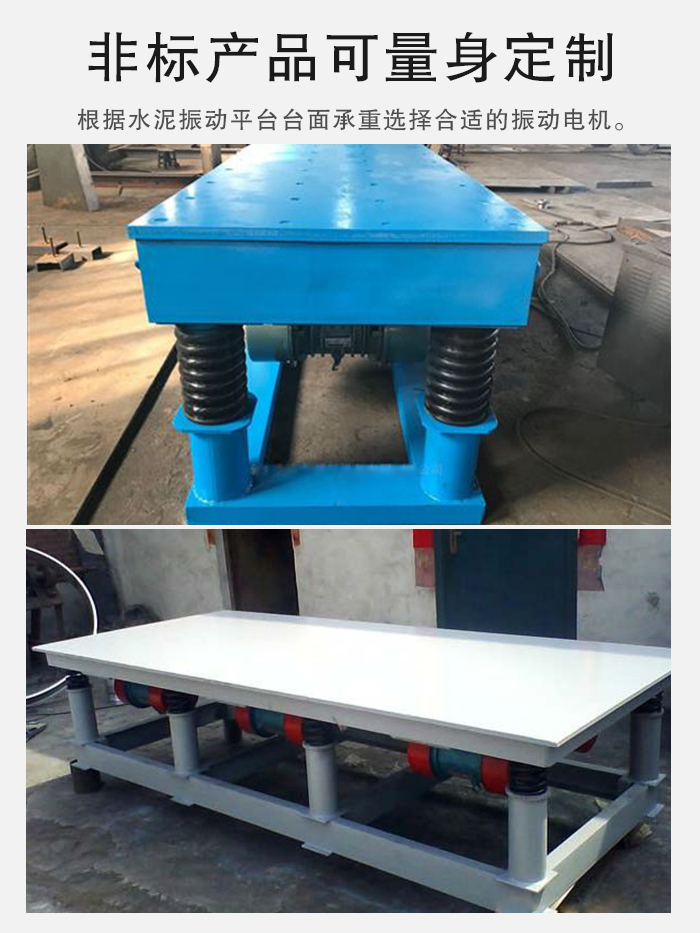 注:水泥振动平台为非标产品,可按客户要求设计。根据水泥振动平台台面承重选择合适的振动电机。