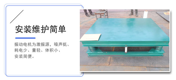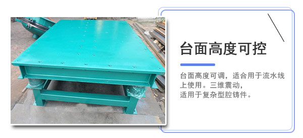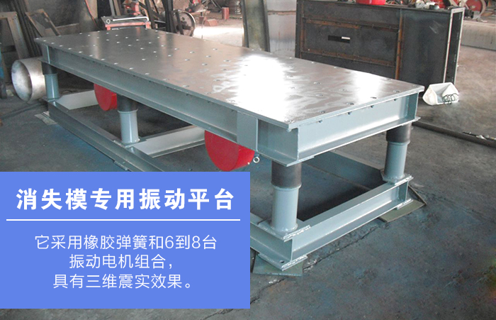 消失模专用振动平台是消失摸铸造生产中的重要系列设备之一,它采用橡胶弹簧和6到8台振动电机组合,具有上下,左右前后的三维震实效果。它具有多结构支撑,结构牢固,密封性好,性能可靠,操作简便,震动频率可调,噪声低,生产效率高等特点。