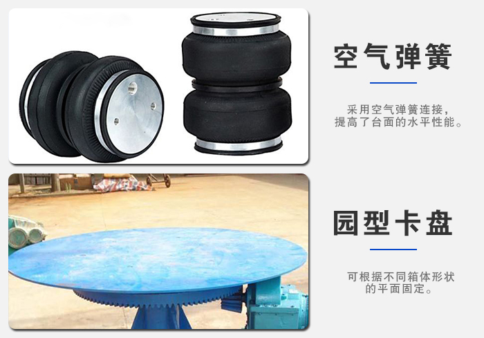 圆形振动平台,螺栓万能卡盘,有效解决不同箱体形状的平面固定。采用空气弹簧连接,降低了噪音,提高了台面的水平性能振动平台台面尺寸可根据不同要求自定?振动平台在使用过程中,可以通过调节振动电机激振力大小、来使平台上物料实现理想的形式。
