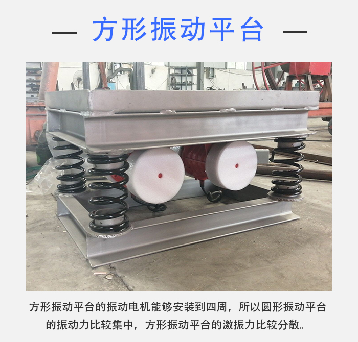 圆形振动平台于方形振动平台除了形状上有一定的差异外,其振动源的大小也有所不同,圆形振动平台的振动电机安装位置是在该设备的底部,而方形振动平台的振动电机能够安装到四周,所以圆形振动平台的振动力比较集中,方形振动平台的激振力比较分散。